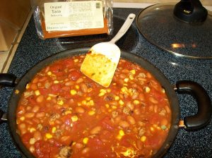 What did I do to the recipe? Because I had 8 oz ground beef, the recipe ingredients were halved. Diced onion (1/2 cup) and two minced garlic cloves were added to the beef while browning. Ground cumin (1/2 teaspoon) was mixed in towards the end of cooking the meat. No fat draining was necessary. Pinto beans were used because I didn’t have black beans (and so what). Frozen corn was used in place of canned (I’m not a big fan of canned veggies like corn). Other than juggling the ingredients, the recipe was followed as written. We used sour cream and hot sauce as accompaniments. It made three servings; dinner for us and enough for Mr. Mike’s lunch the next day.