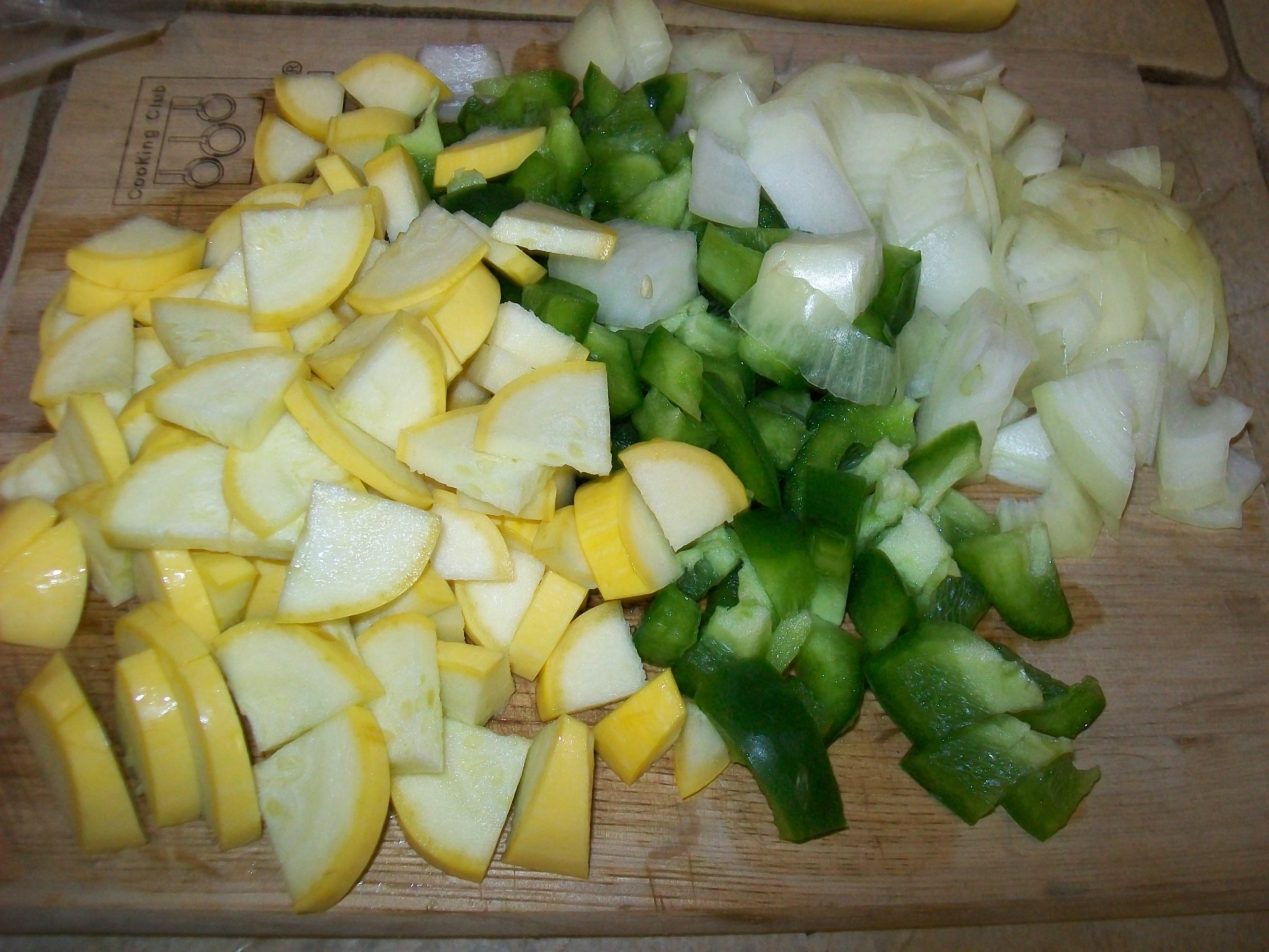 Onions and peppers chopped in 1/2″ pieces. Crush garlic to release allicin before chopping