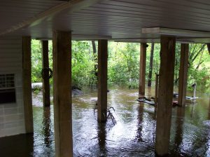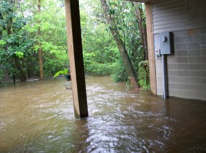 The leaning, partly submerged tree sits on the creek bank edge during dry times. You can see the water creeping towards our concrete pad under the house.