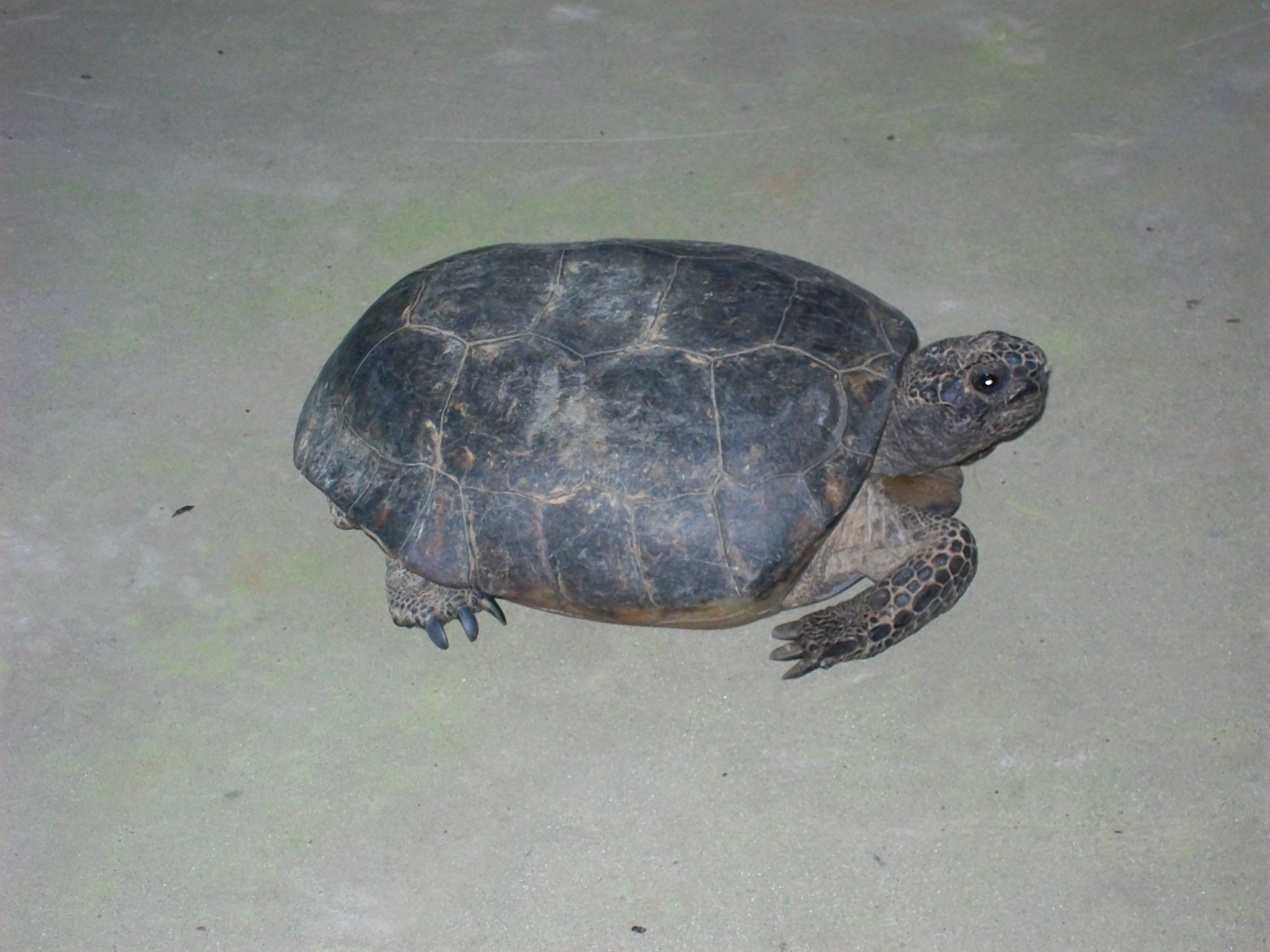 A gopher tortoise! Their numbers are decreasing due to loss of habitat. They live in tunnels, sometimes over 40 feet long. Now I understood the purpose of that mysterious hole under the trees in our front yard. Note the large forelegs.
