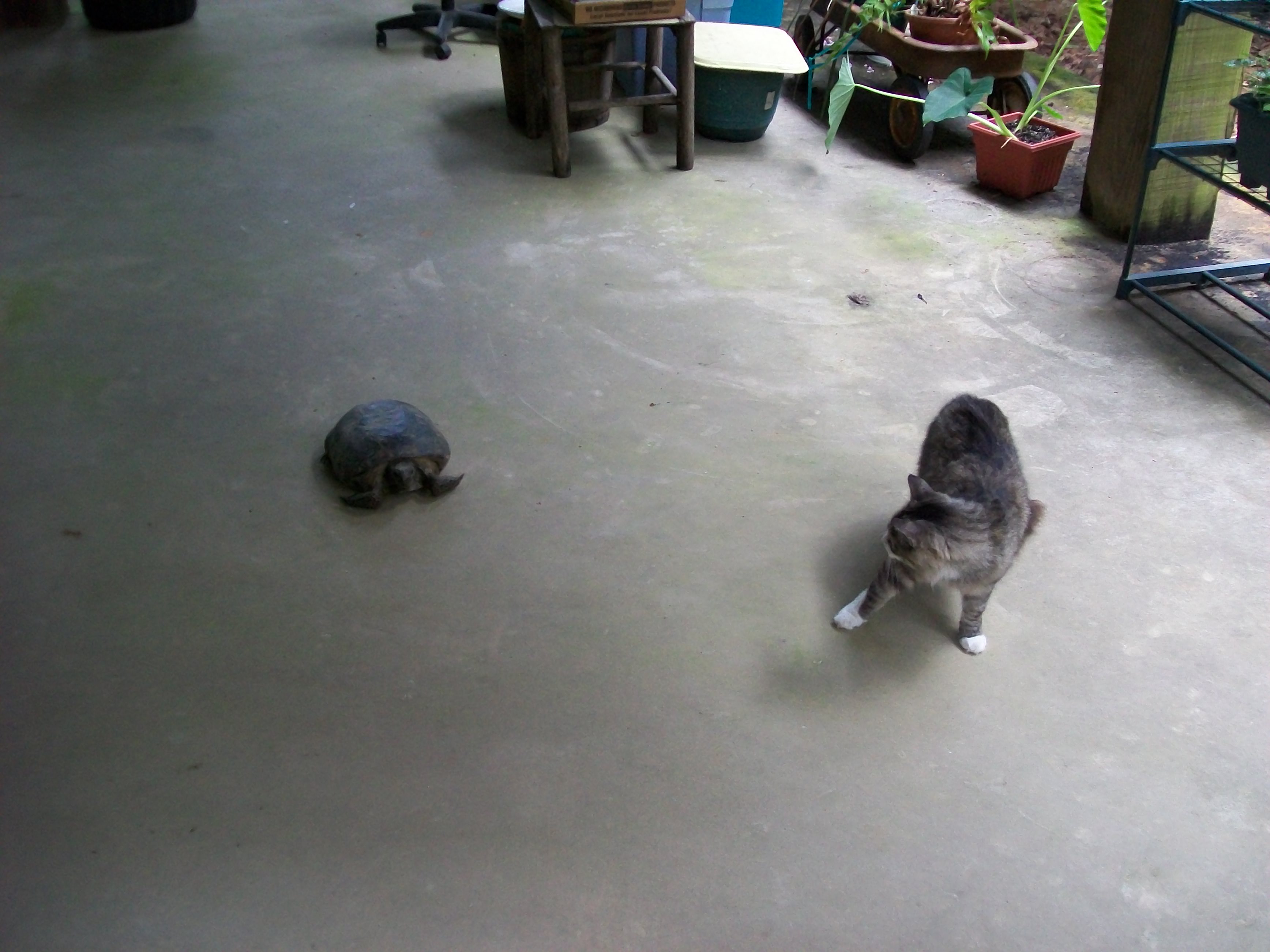 This editorial appeared last week. While I don’t want to share my spot on the sandbar with a gator, they deserve to live their lives. You’ve probably noticed Mr. Mike and I are animal lovers. Six cats scrounge their food from us. We have birdfeeders, including a hummingbird feeder. It’s interesting to watch their social interactions while we sip a beer on the deck. We’re on the lookout for turtles on the road whenver we’re out, two wheels or four. This is the time of year they’re “trying to get to each other”, as a biker friend of mine once explained. He mounted a cardboard turtle transport box on his Triumph motorcycle. We’re not that elaborate. We just flip the flashers, pull over to the shoulder, scoop the turtle from the road and place him/her on the side of the road they pointed towards. They’re usually laying on the road with just their heads sticking out, a prime target for the cell phone talking driver in his monster manly truck going 70mph. One time Mr. Mike watched in horror as one of these huge pickups ran over a turtle, squashing it, before he could rescue it. Most of the turtles are box turtles, though we have encountered river cooters, map turtles, and yes, a snapping turtle. We didn’t pick him up, just “guided” him across the road with a stick, which he viciously bit if it got too close. But the most surprising discovery occurred last week when I had parked the car and was getting ready to climb the stairs to our house.