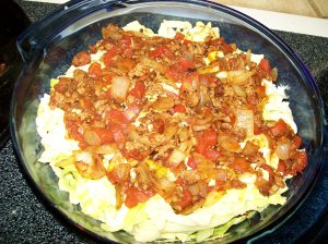 Take about half the cabbage from the casserole; set on a plate (or casserole lid; I am lazy about washing dishes). Place half the meat mixture on the cabbage in the casserole. Sprinkle with 2 tablespoons of cheese (if using). Put remainder of cabbage on the meat, then layer the rest of the meat mixture on the cabbage. Add 2 tablespoons cheese (if using). Cover casserole and return to the microwave and cook for about 10 minutes on high. Let set covered for about 2-3 minutes. Be careful when removing the lid – there will be lots of steam (and steam burns are no fun, believe me). Enjoy with beer (Guinness or PBR suggested) and crusty bread.