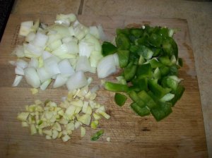 Onions and peppers chopped in 1/2″ pieces. Crush garlic to release allicin before chopping