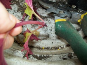 Trimming coleus - only two or three leaf pairs are needed for cuttings. Remove leaves at the "joint"